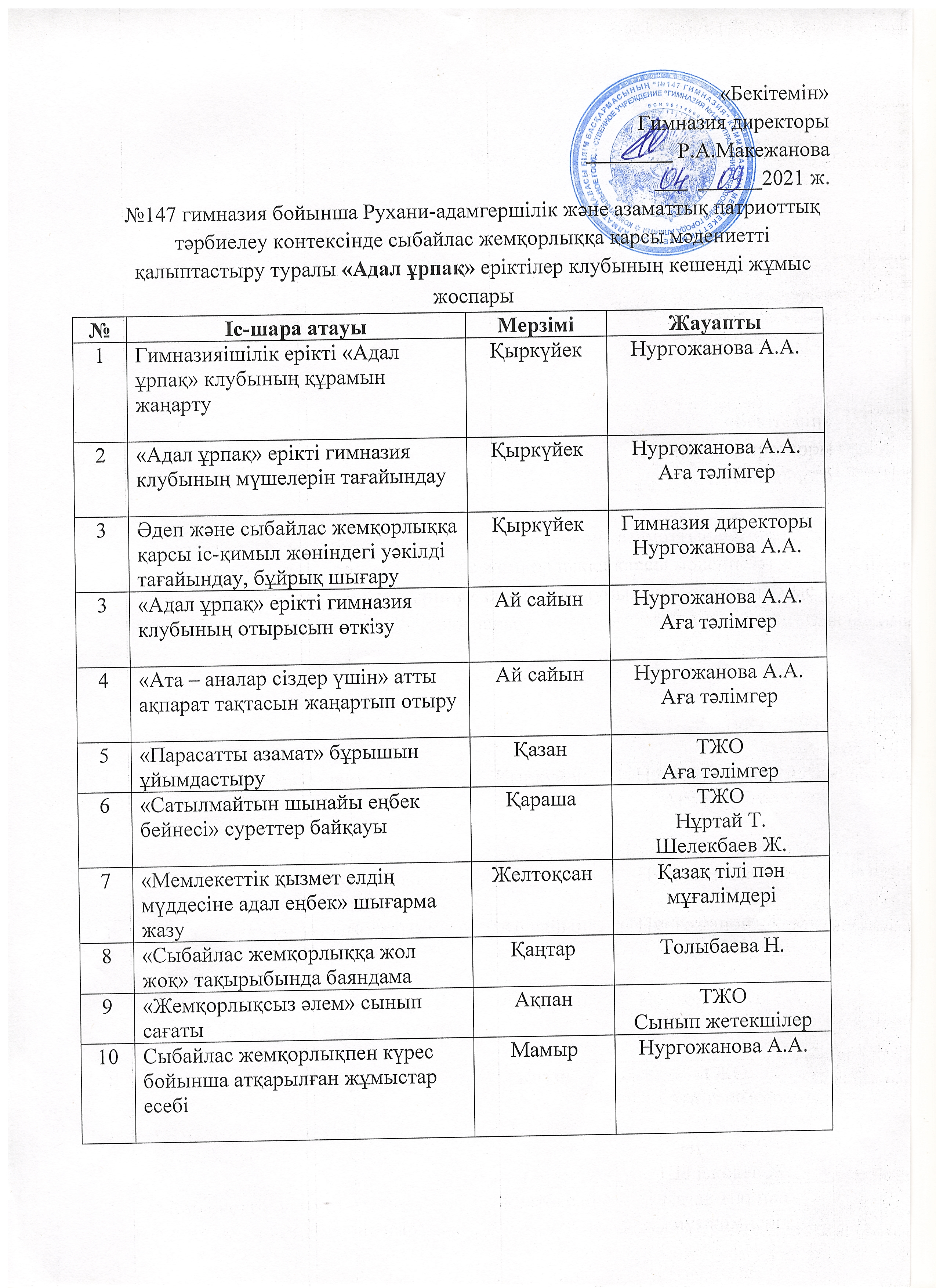 » Адал ұрпақ клубының жоспары