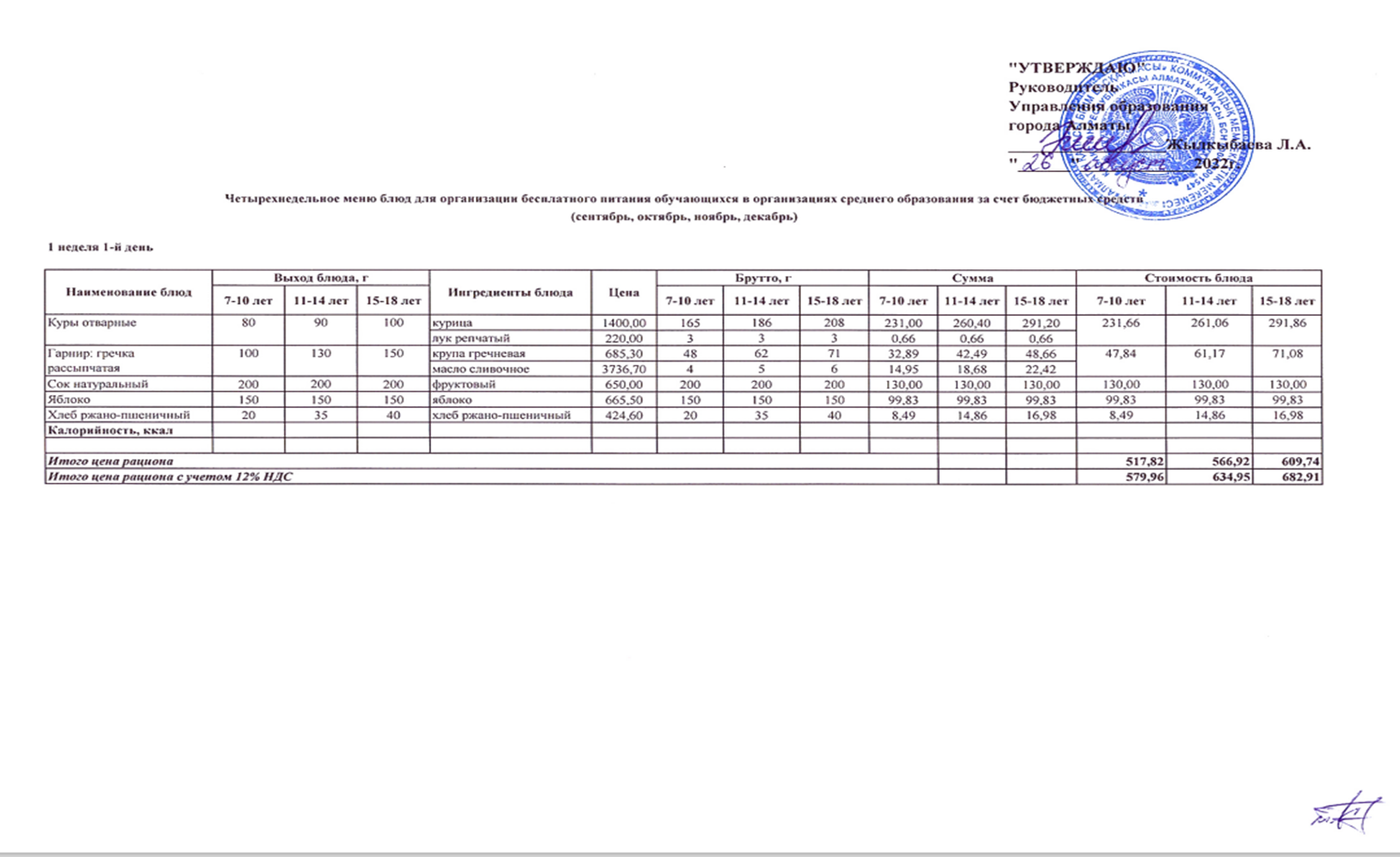 Алматы қаласының Білім басқармасының тамақ мәзірі (қыркүйек, қазан, қараша, желтоқсан)